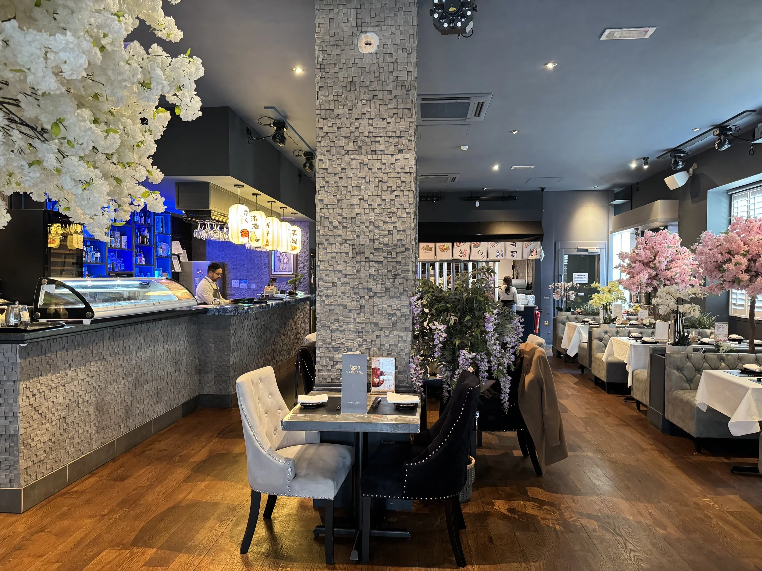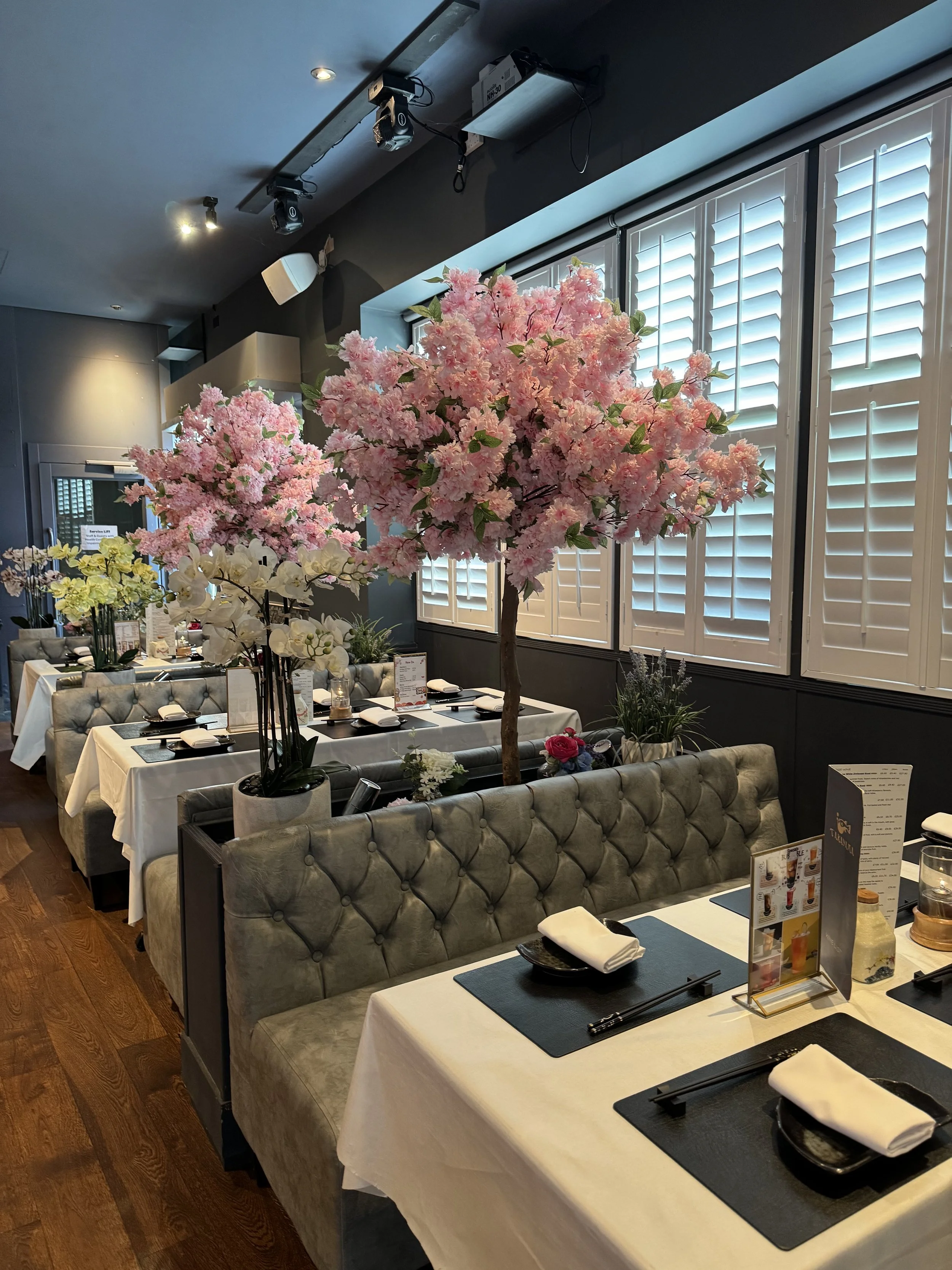 Our ground floor features a refined floral theme, adorned with the delicate allure of cherry blossoms. Greeting visitors, when available, is our delightful Bella robot, ever at your service. Within this splendid setting, our bar area offers a picturesque panorama